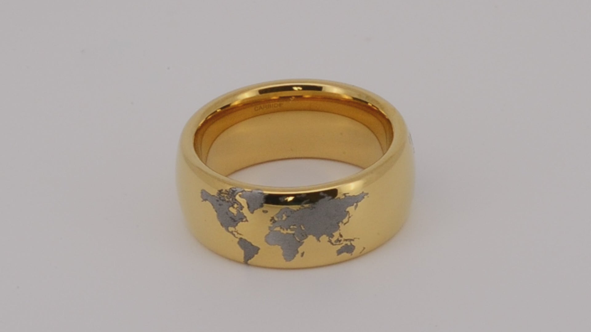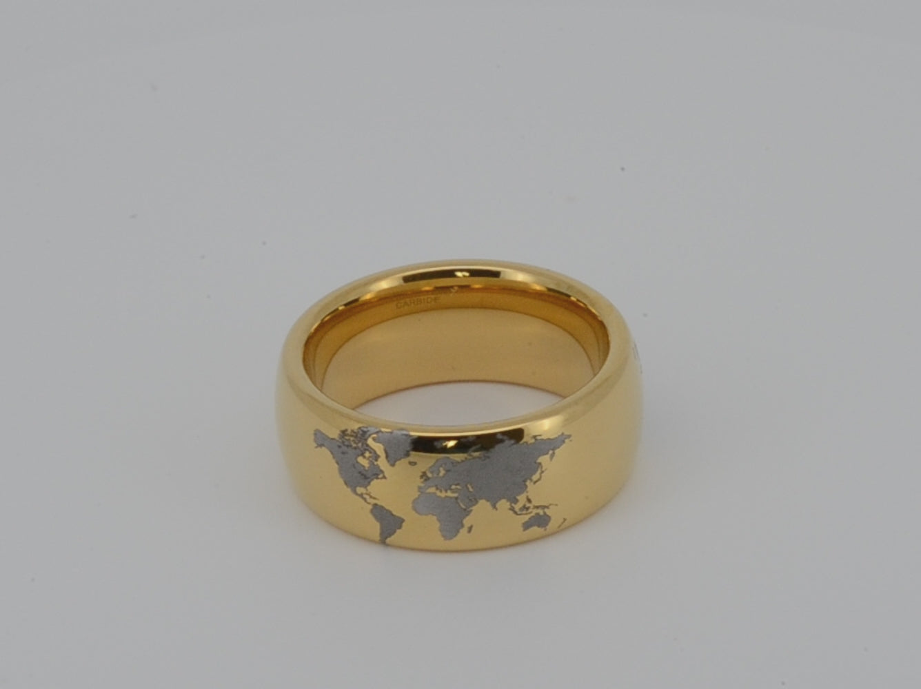 Highly polished Yellow gold tungsten ring with unique elegant white engraving of earth continents. An ideal elegant gift for travellers and adventurers. Premium anniversary wedding band for special occasion or engagement. Luxury promise ring for friend, girlfriend, mother, mom or granny. Ideal original personalized present for her and him